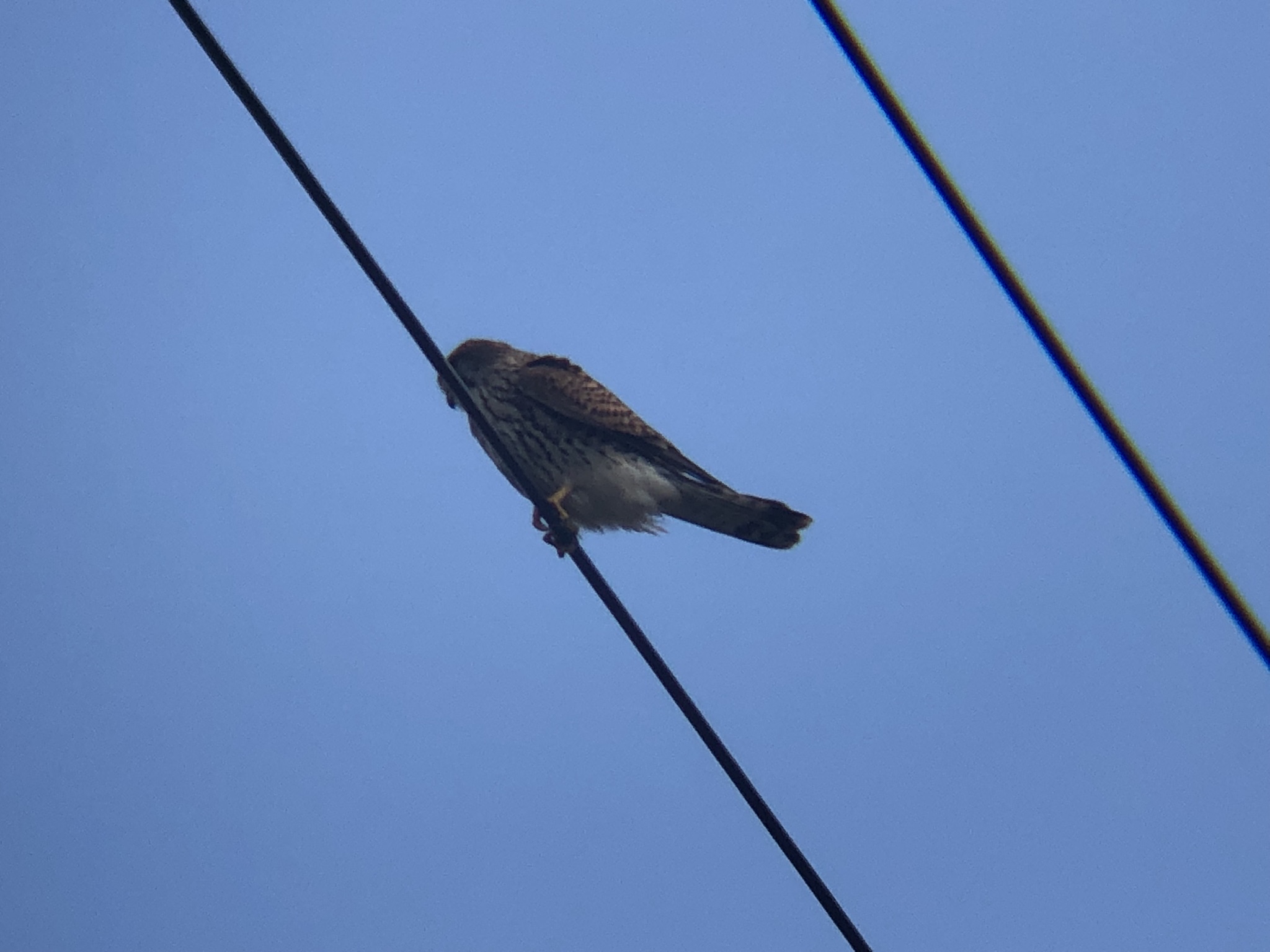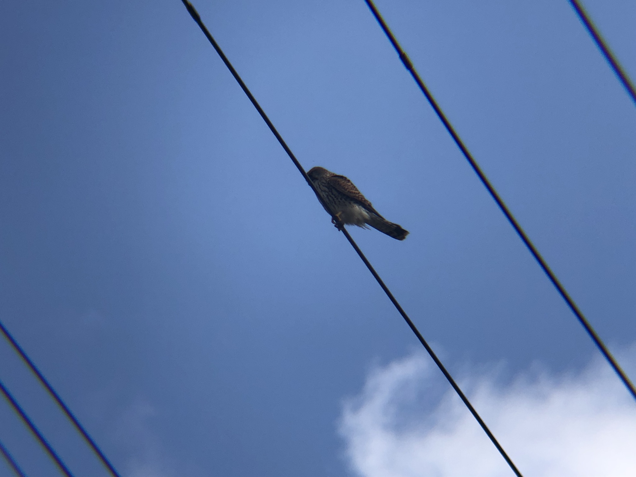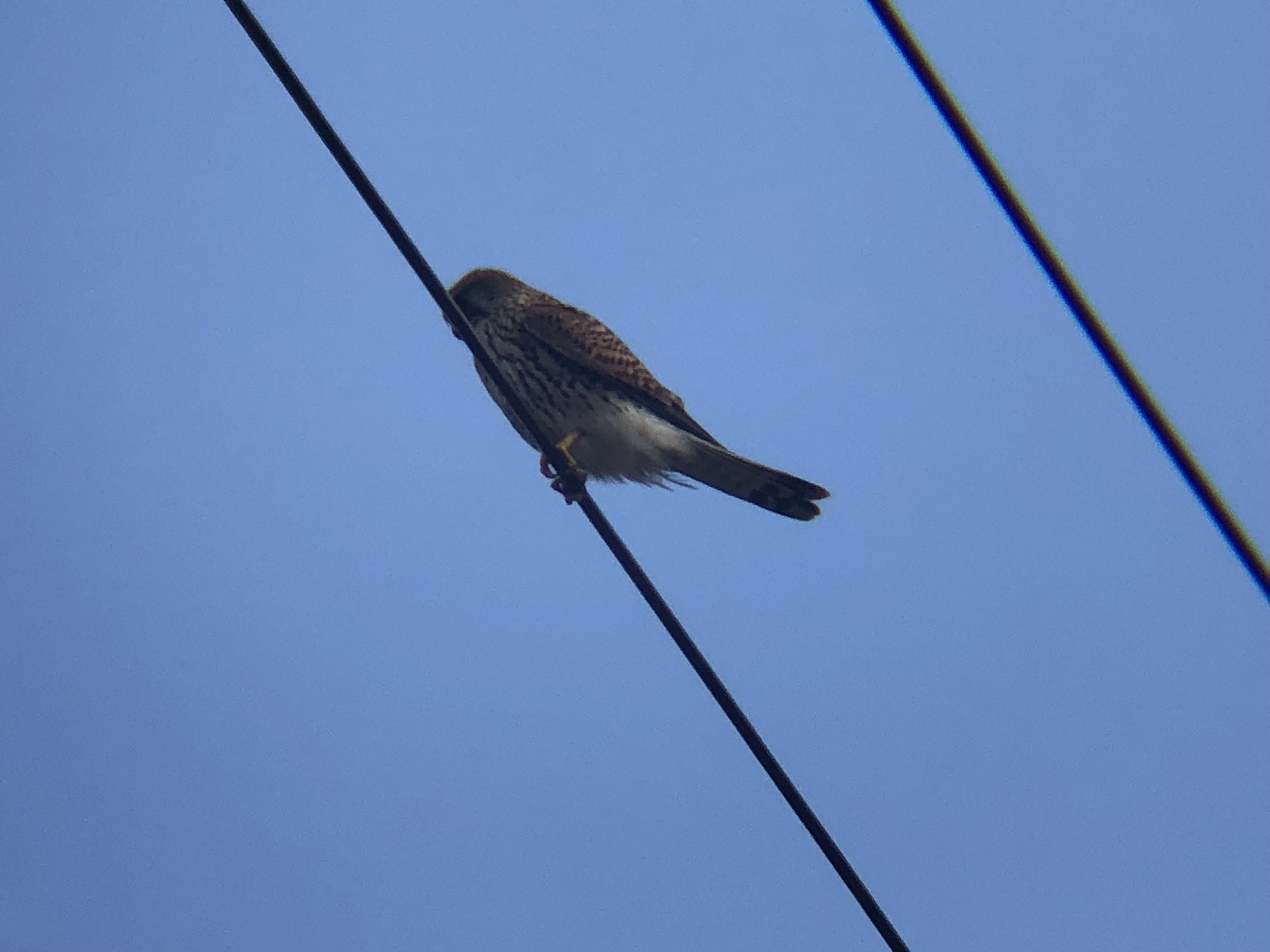 チョウゲンボウはハヤブサ科の猛禽類です。高い声で「キィーキィー」と鳴きます。大きさはハトやカラスと同じくらい(30から40センチ)の体格です。トビとは明らかに大きさが違うので田んぼなどでハトくらいの大きさで茶色い背中の猛禽類を見たらチョウゲンボウかもしれません。ハヤブサとの見分け方は、チョウゲンボウの胸の模様は縦。ハヤブサの胸の模様は横。色的にはハヤブサのほうがグレー(灰色)を感じます。